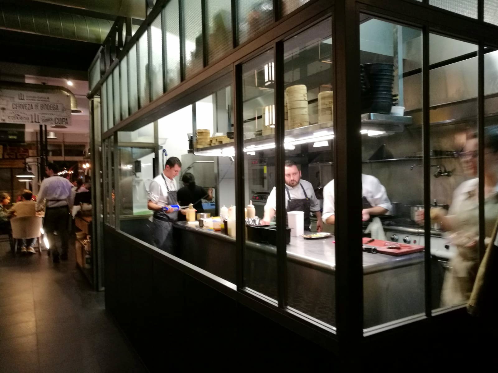 Tiene una estupenda terraza exterior para disfrutar tomando una caña y en el interior es de agradecer la cocina abierta donde ver al equipo de cocina en acción.